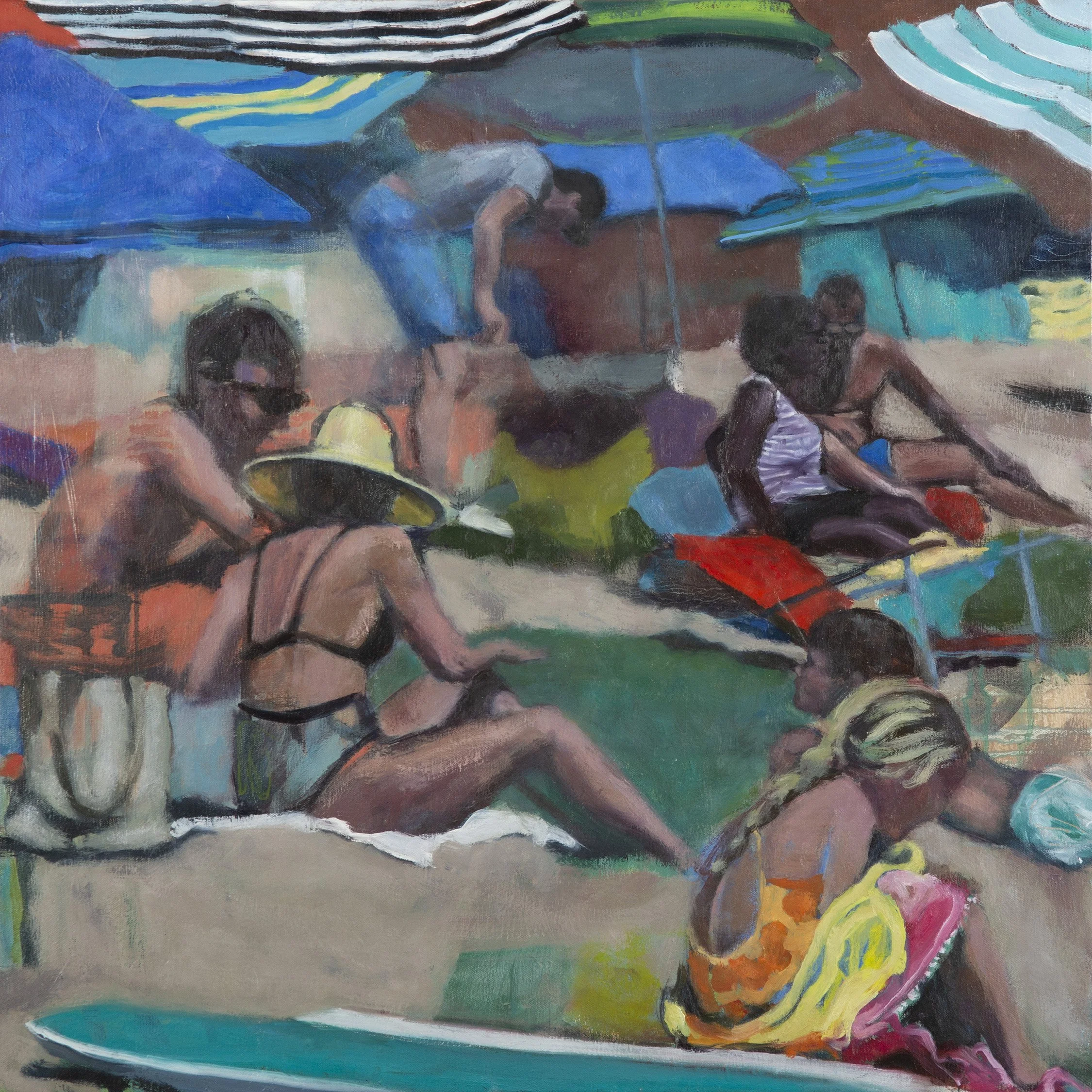 Working from photographs and observation, l use the arrangements of bodies, umbrellas, sand and ocean to compose a day in the life of a beachgoer. Together these shapes and figures create a human landscape where people gather in close proximity, yet remain psychologically separate. I am interested in capturing each individual, but together the forms and figures create an engaging tableau. Brief interactions and quiet tensions emerge, lives intersect in moments captured in paint. The use of bold color relationships, light and simplified forms heighten the sensory experience of the scene, allowing the space to move between representation and abstraction.